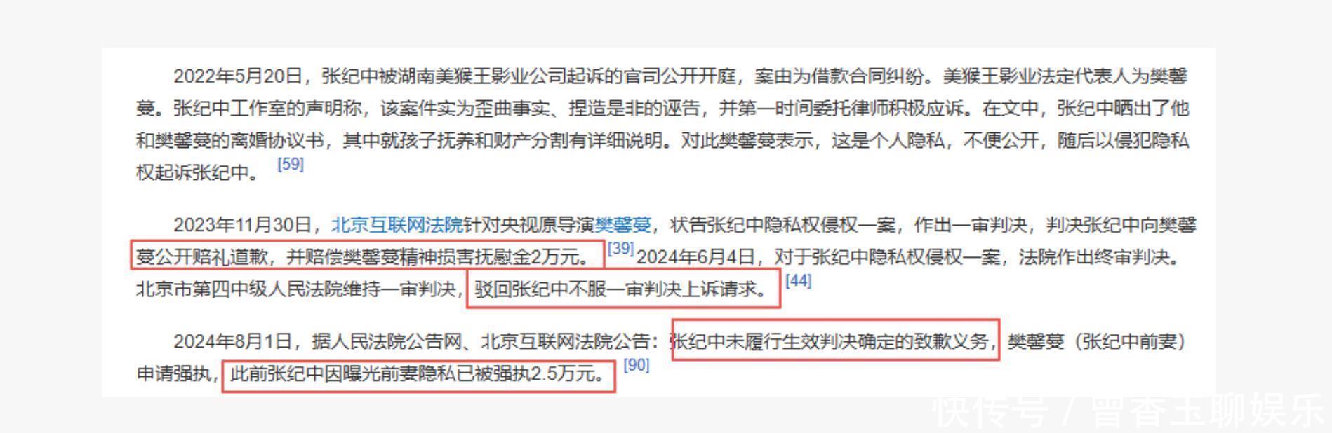 跟前妻缠斗三年的财产纠纷2022年5月,湖南美猴王影业把张纪中告上法庭,案由是借款合同纠纷。这公司法人代表就是张纪中的前妻樊馨蔓。张纪中工作室马上发声明,说这是诬告,还把离婚协议书晒了出来。樊馨蔓反手就是一个侵犯隐私权的反诉。